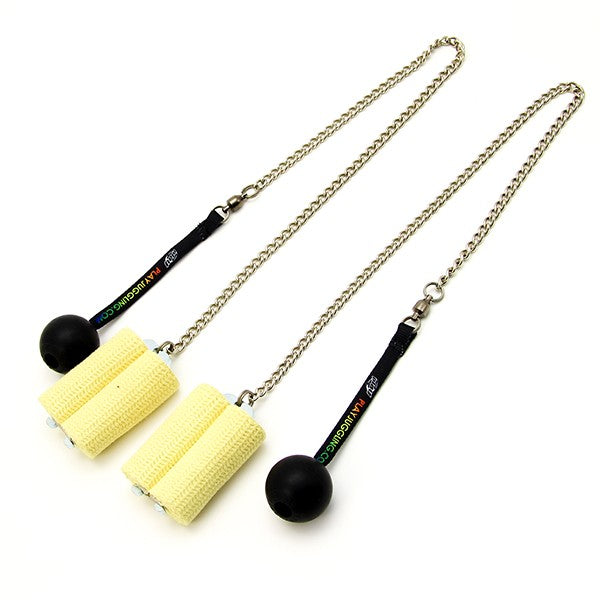These poi are mounted with heavyweight link chains, smooth swivels and a silicone swinging knob in place of a traditional handle.